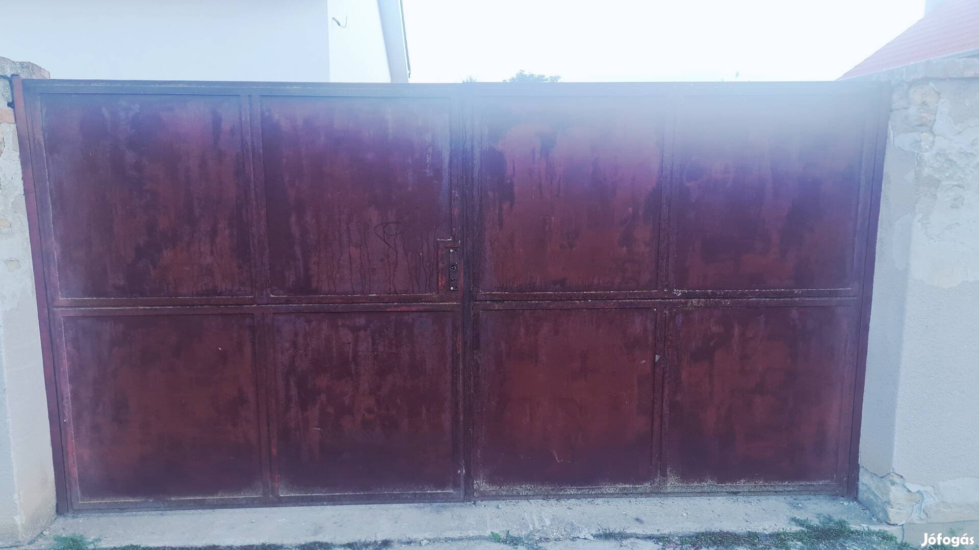 3,4x1,8 m-es kétfelé nyíló vaskapu. 40x40-es zártszelvény keret, 4 részre osztott merevítéssel. 40x40-es tartóoszlopokkal, sarokvasakkal, jelenleg már bontott (rozsdás) állapotban. Személyes átvétel: Szeged-kiskundorozsma.