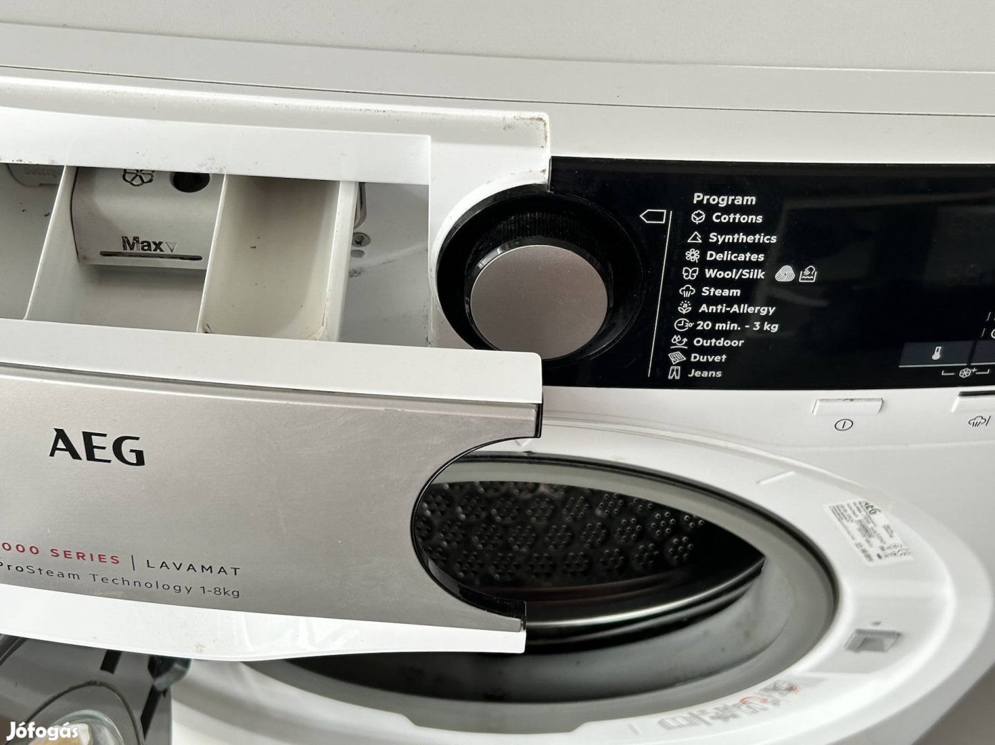 6 éves AEG L7Fee48S mosógép eladó, hibátlanul működik, külső esztétikai hibája nincs, az ajtó körüli belső körgumit kell tisztítani, lerakódások vannak rajta végig körben, illetve a dobban az egyik borda vége törött (lásd képeken), ettől mosni lehet vele, így használtam eddig.