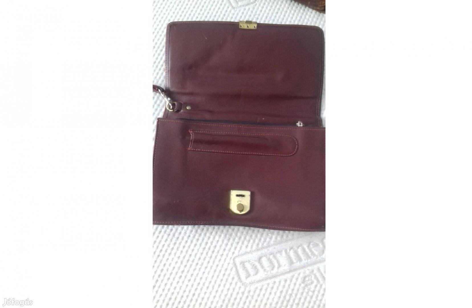 Feleslegessé vált barnás-bordó színű autóstáska kedvező áron eladó. A táskában minden személyes dolog (például: iratok, pénztárca, telefon,kulcs, szemüvegtok) kényelmesen elfér. Elosztása tekintetében fekete színű selyemmel bélelt 2 rekeszes, melyet egy cipzáras zseb választ ketté. A hátulján egy praktikus, cipzáras külső zseb helyezkedik el. Csuklópánt teszi kényelmessé a viseletét.