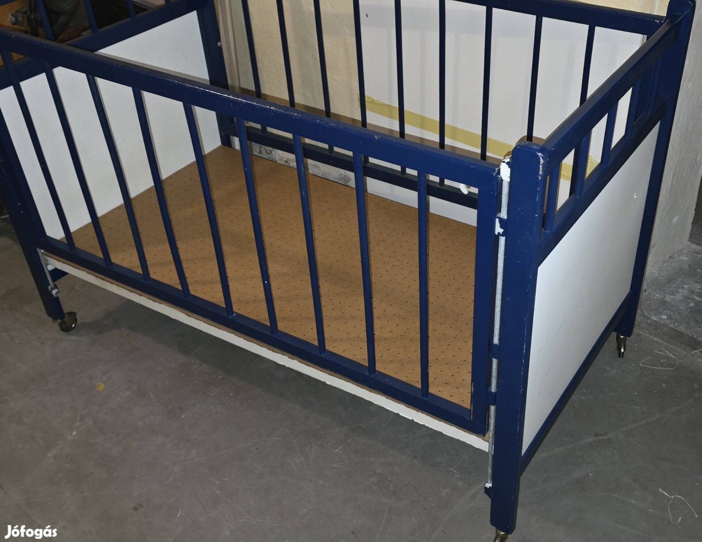Kerekeken guruló praktikus, leengedhető rácsos használt babaágy matrac nélkül olcsón eladó