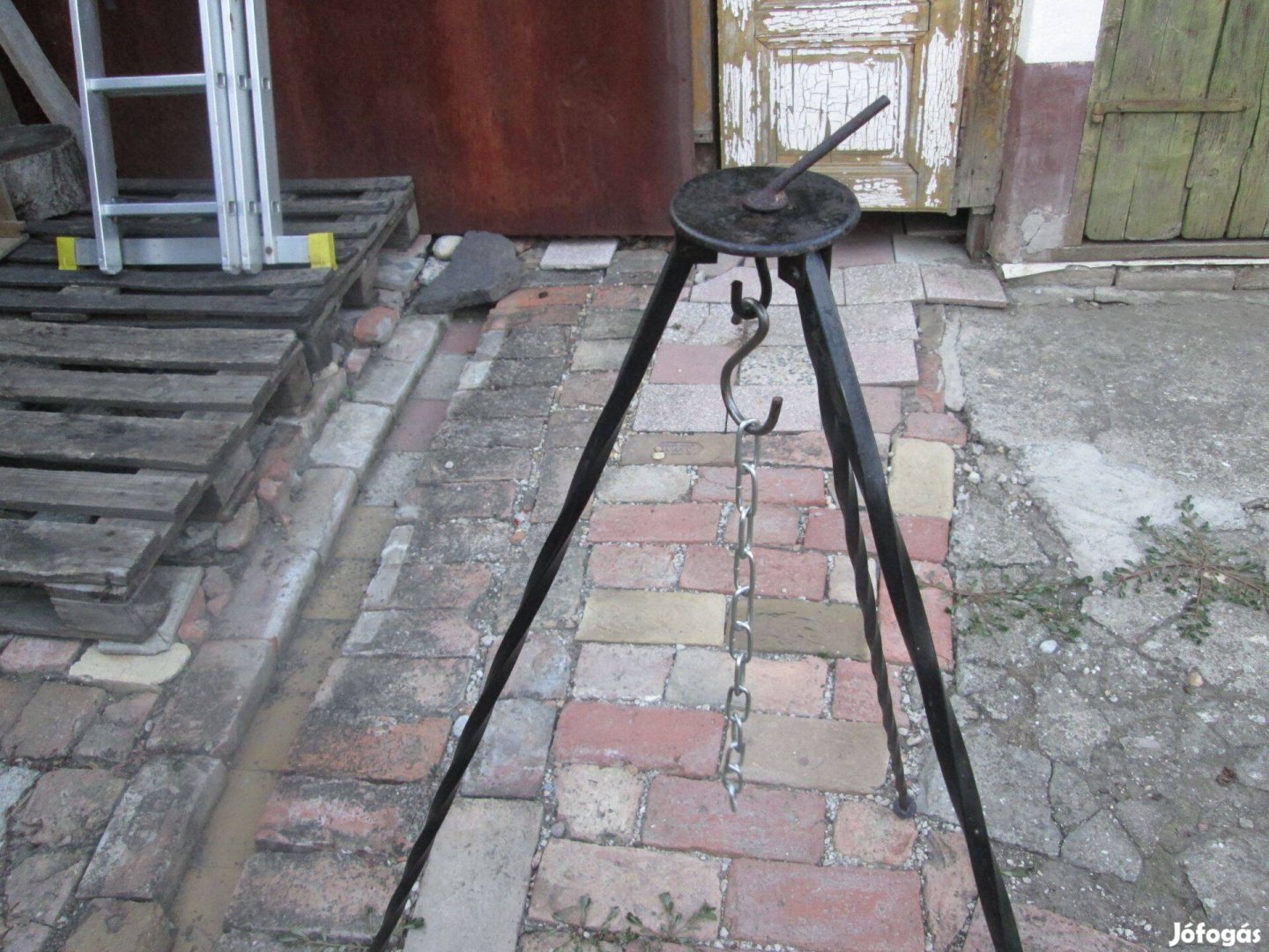 Bográcsállvány lánccal magassága 120 cm. Tűskés végek amint leszúrható talajra. Jó állapotban eladó.