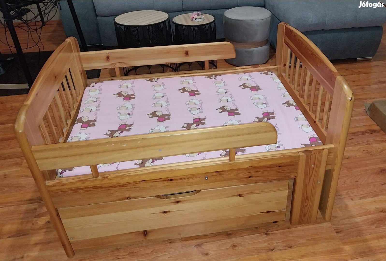 Újszerű állapotú tömör fenyő gyerekágy amely 3 lépésben bővíthető így sokáig kihasználható. Az ágyhoz tartozik ágyneműtartó is.