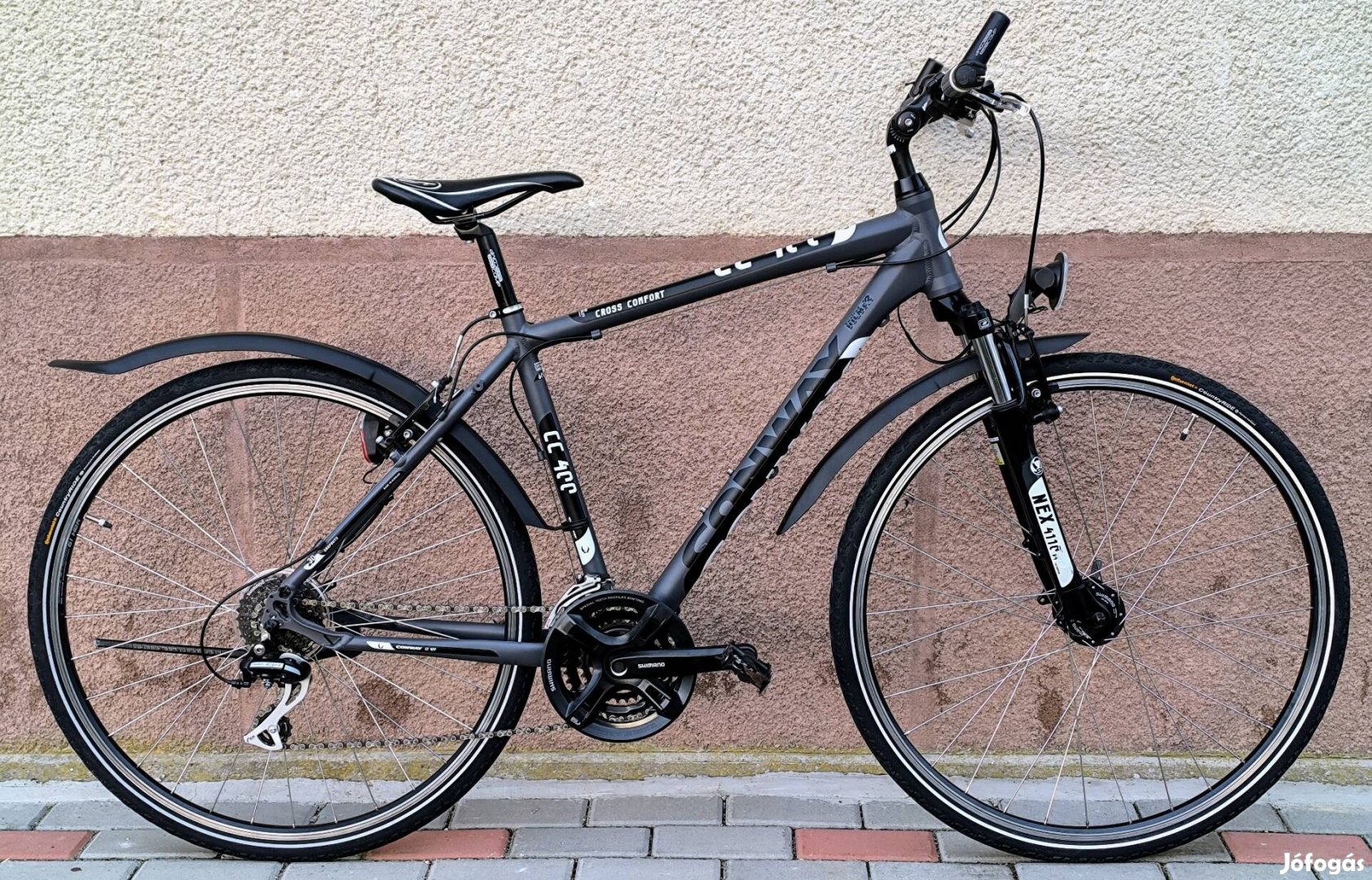 Conway Cross Comfort. 28-as, újszerű, rendkívül megkímélt, nagyon szép, német, minőségi trekking kerékpár. 51cm-es, könnyű alumínium váz, 28-as, gyorszáras alukerekek, 28-as, gyorszáras alukerekek, jó állapotú Continental Country Ride reflex csíkos, defekttűrő gumik, Shimano Acera 3×8 váltó, Shimano első váltó, Shimano V fék, Shimano fékváltókarok SR Suntour Nex állítható első teleszkóp, Shimano hajtómű, fém pedálok, 3 pontban állítható kormányszár és kormány, Shimano agydinamó, halogén lámpa, parkírfényes világítás, Black COMP nyeregcső, kényelmes sport ülés, ergonómikus sport markolat, levehető műanyag sárvédő. Alig használt, kitűnő állapotban, átvizsgálva, leszervízelve eladó. Költségmentes, azonnal használható. Alvázszámmal, adásvételi szerződéssel.