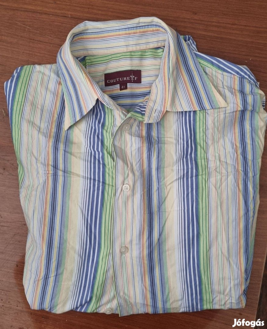 Eladó Újszegeden a képen látható férfi ing, Hosszú ujjú Couture ing, csíkos, 41-es méretű, hibátlan állapotban, mellbőség: 128 cm, hossza válltól: 78 cm, 600 Ft.