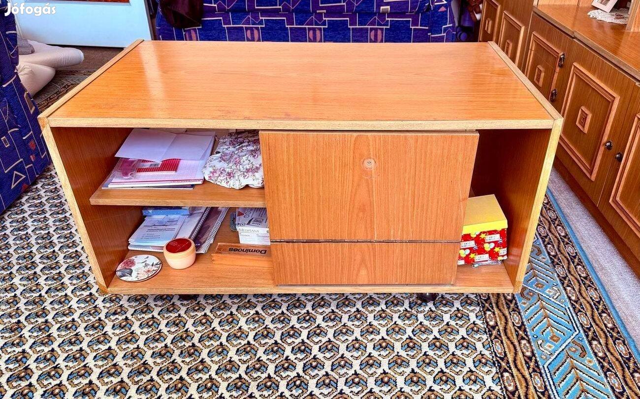 Fiókos, görgőkkel ellátott dohányzóasztal eladó, praktikus kialakítással és nagy pakolófelülettel. Ideális nappaliba, könnyen mozgatható.