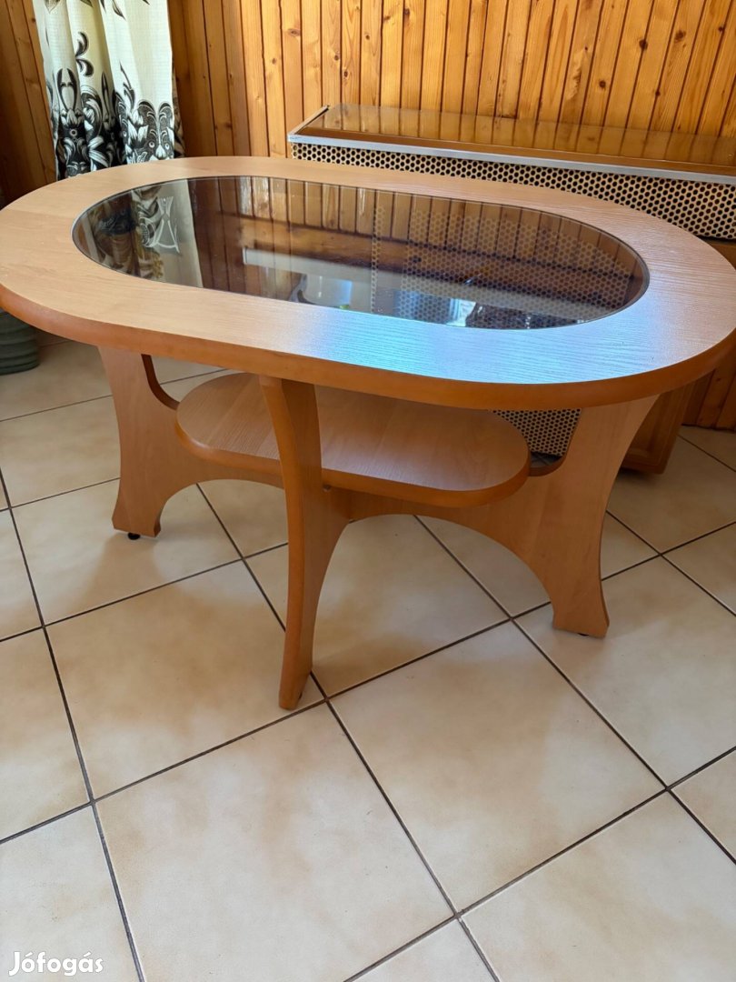 Ovális, üvegbetétes dohányzóasztal eladó. Praktikus pakolási lehetőség ad a kiegészítő alsó polc..