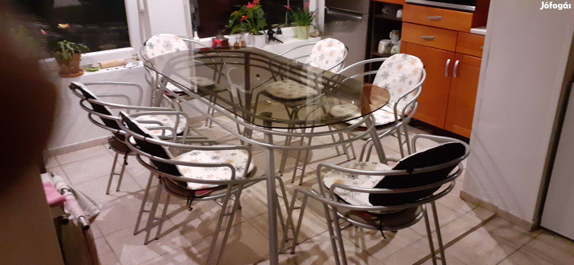 Acél csőbutor, szinterezett matt ezüst szinben 1600x800as füstüveg lappal, pisztácia kárpitos 6 székkel.