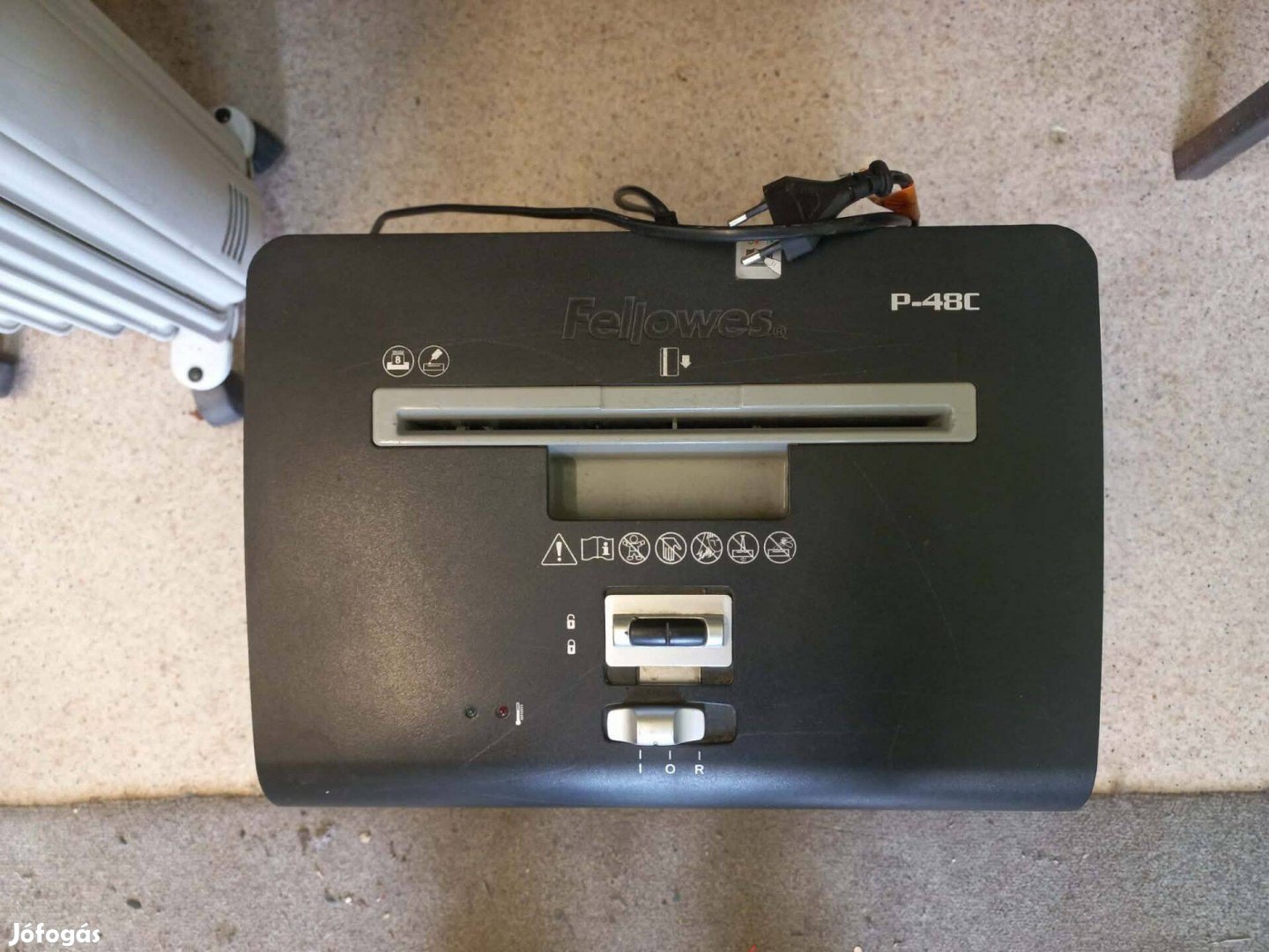 Eladó a képeken látható Fellowes márkájú iratmegsemmisítő. A világszerte elismert gyártó készüléke, amely nem igényel külön kosarat, mivel saját, gyárilag kialakított gyűjtődobozzal rendelkezik, amibe az aprított papírcsíkok hullanak.