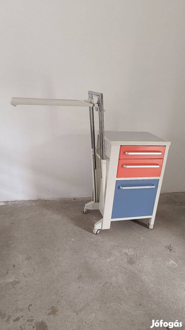 Használt éjjeliszekrény - kihajtható asztallapos típus! Fém szekrény, színes fiókokkal! Minden pokolófelület 2 oldalról nyitható, az asztallap jobbos és balos használatra is alkalmas. Gurítható! 115 asztallap max magassága, 36x57cm a lap mérete. A szekrény 89cm magas, 54 széles (57 a fogantyúval). Szekrény mélység 41cm és 47cm a fogantyúkkal Alul kerékkel 65cm széles.