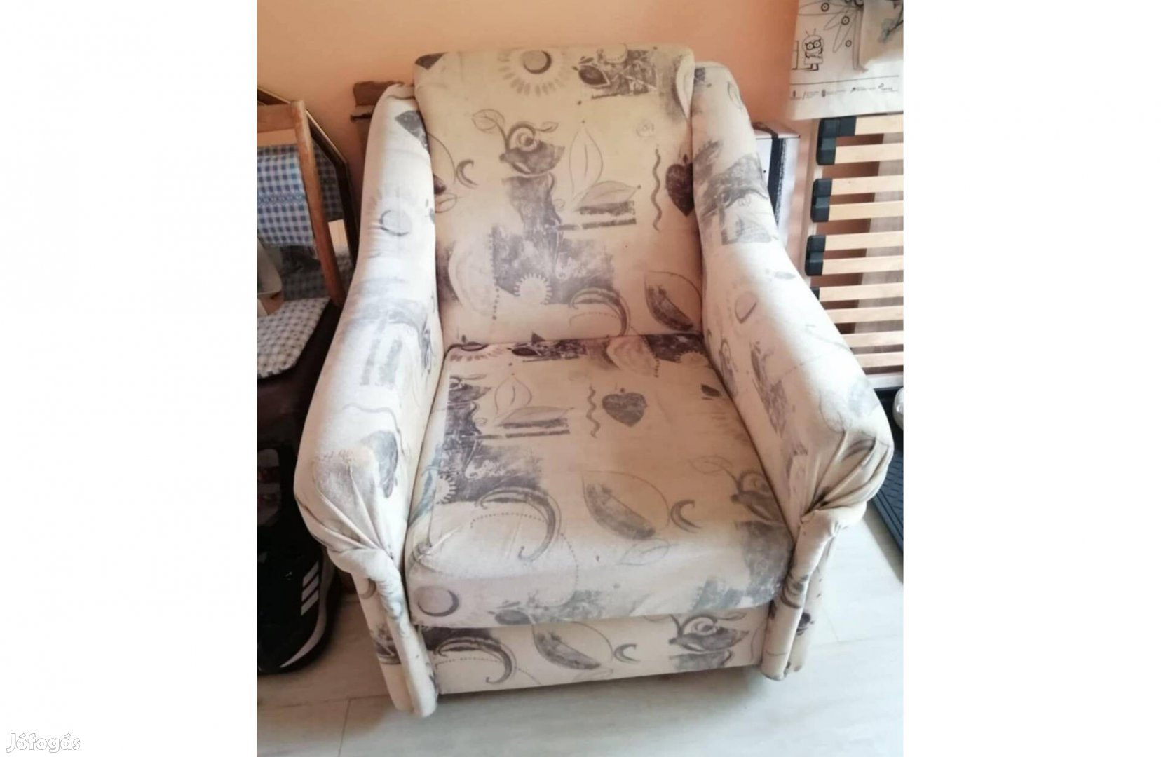 Fotel lábtartó puffal eladó, kárpitja több helyen kopott, de rendkívül kényelmes ülőhely.
