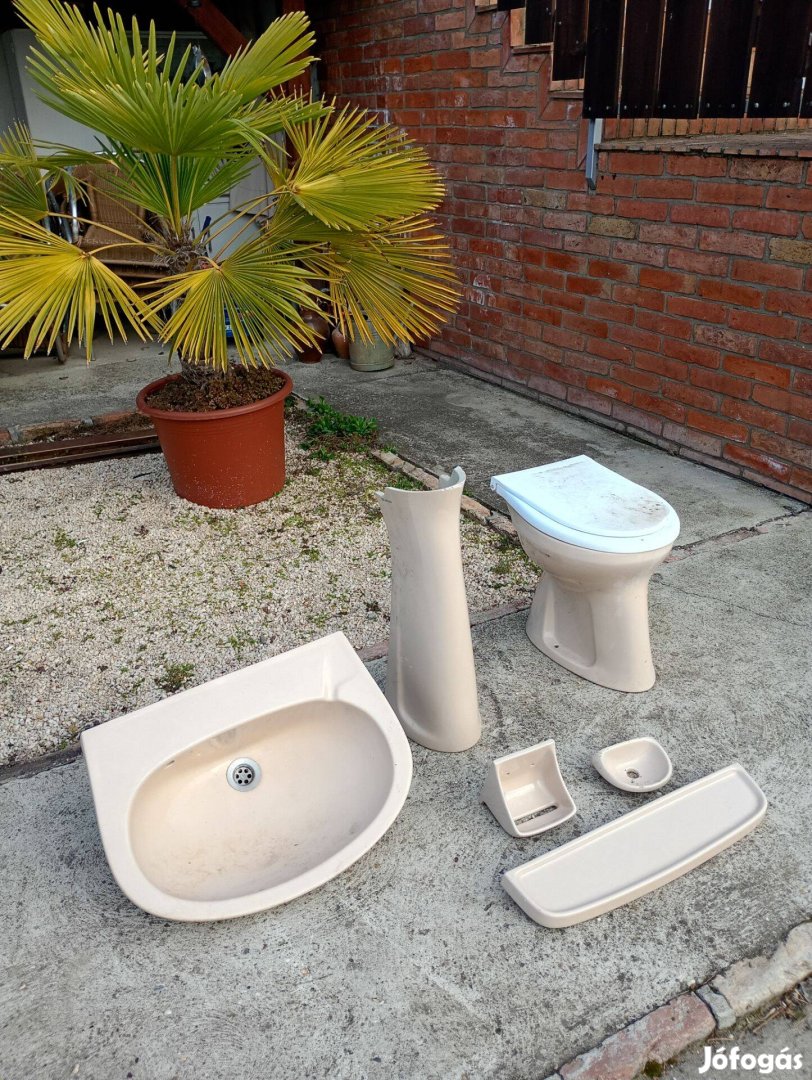 A képen látható Fürdőszoba Szaniter wc csésze (sérült-lásd fotó) , mosdó kagyló, wc papír és szappan tartó , illetve polc.