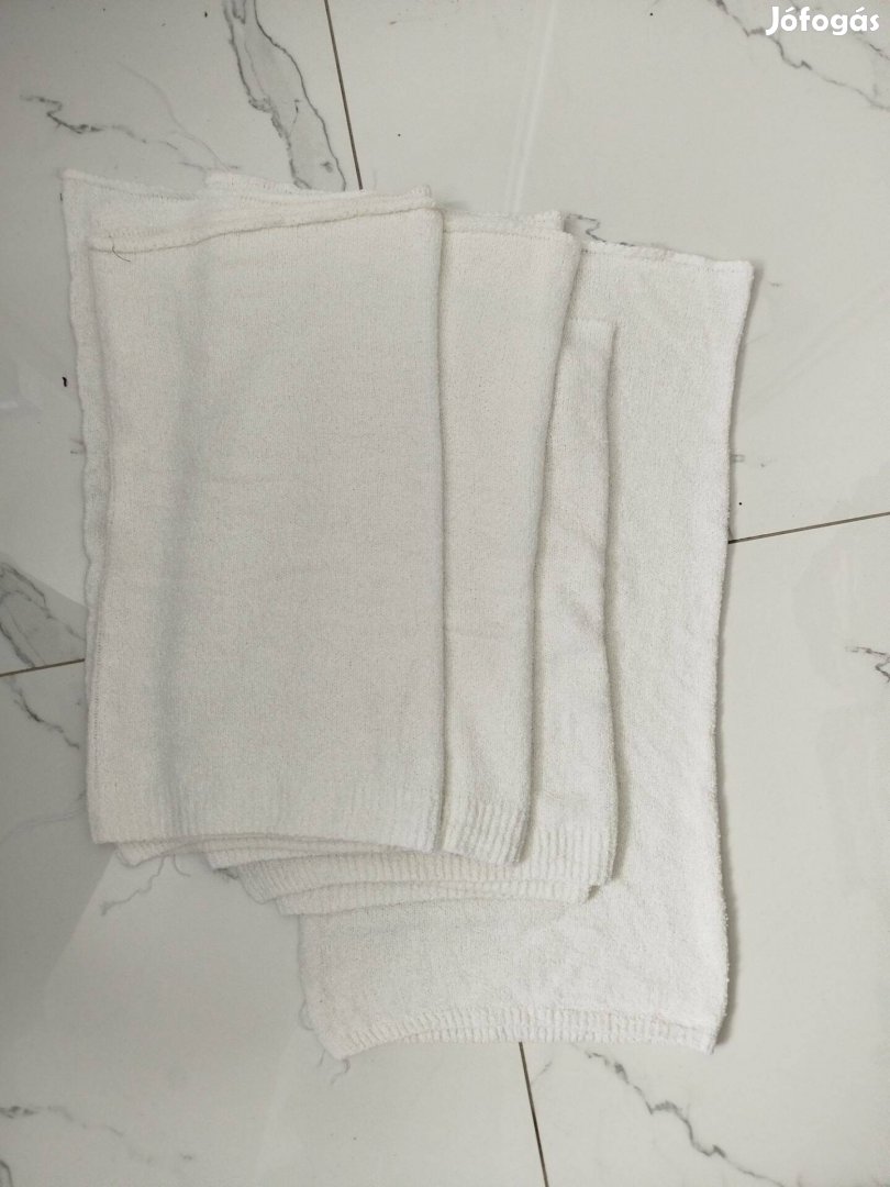Fehér gépi kötött buklé idomlapok 1 pár szél: 56cm, hossz: 46 cm, 2 pár azaz 4 db de szét kell választani mert egybe van kötve hossz: 54 cm széless: 58 cm. 1 db hossz:65 cm, széless:66 cm. Hibátlan állapotban! 1 pulcsi vagy kardigánra bőven elég!