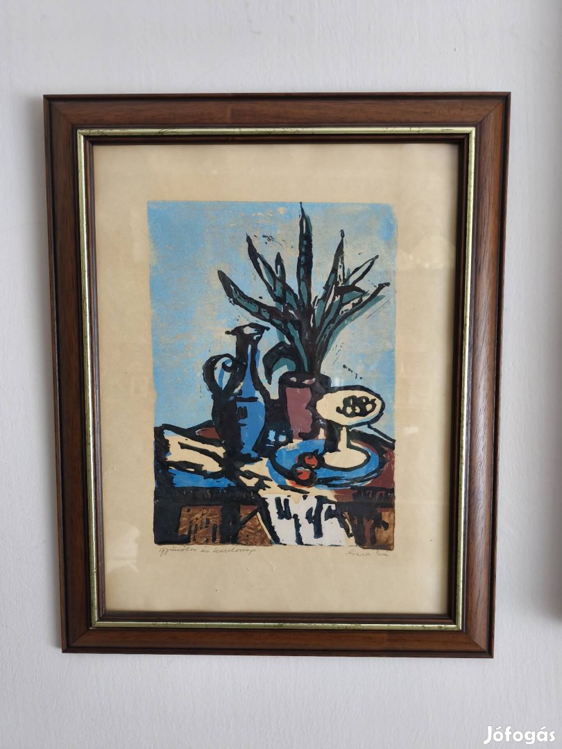 Eladó a képeken látható Gera Éva színes linómetszete, hozzá illő kerettel.