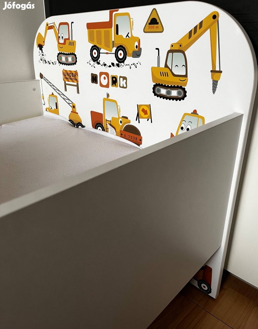 Járműves mintájú leesésgátlós gyerekágy,ágyneműtartóval,ágyráccsal!Méret:70x140cm.A hibája annyi,hogy az egyik léce megrepedt,amit külön fotóztam is!Használatát egyáltalán nem befolyásolja a repedés.