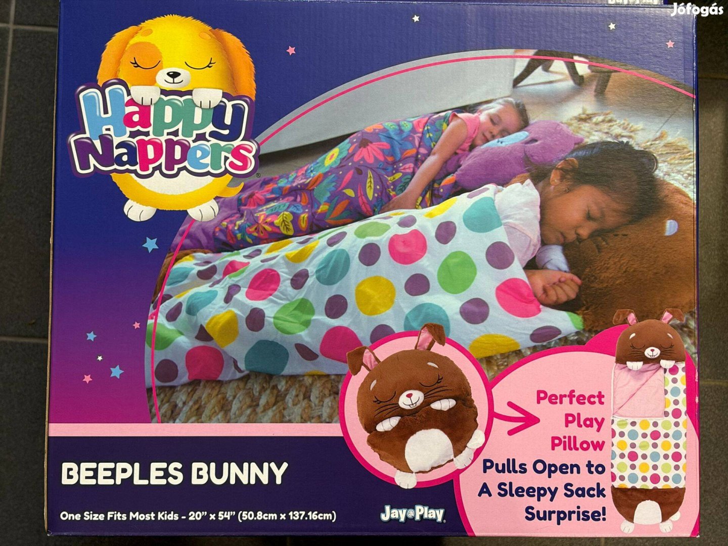 Hálózsák és párna is egyben! A hálózsák összehajtható egy párnává, ami akár plüss játékként is funkcionálhat. Mérete: 51cm x 137cm, így több korosztálynak is megfelelő lehet. Teljesen új, egyszer sem volt használva. A csomagolás bontott, megnéztük milyen. Méret miatt vissza akartuk vinni, de sajnos a blokk már nem volt meg. Van egy sünis is, ha még nem vették meg :)