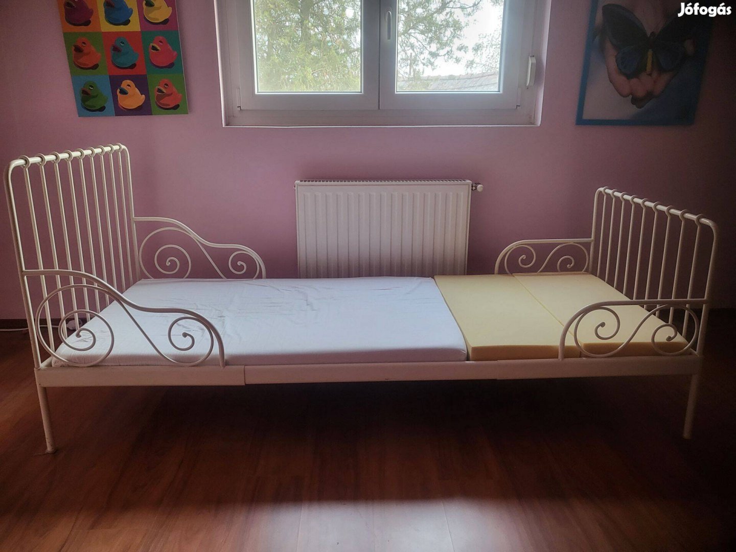 Eladó a képen látható gyermekágy .3 méretben állítható A legnagyobb és a legkisebb méretet fotóztam. Matracot és a rózsaszín éjjeliszekrényt is adom az ágyhoz.