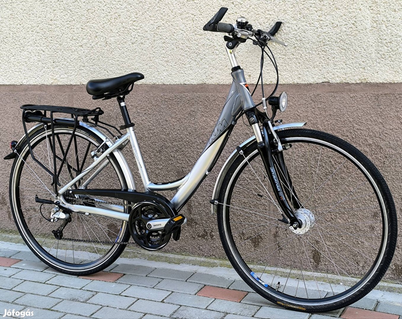 KTM LIFE Fun. 28-as, újszerű, rendkívül megkímélt, nagyon szép, minőségi trekking kerékpár. 43cm-es, alacsony átlépésű alumínium váz, 28-as Zac 2000 rigida alukerekek, Continental Ride Tour reflex csíkos, defekttűrő gumik, Shimano Deore 3×8 váltó, Shimano V fék, Shimano Acera fékváltókar, SR Suntour CR-8V állítható első teleszkóp, Shimano hajtómű, műanyag plasztik sárvédő, 3 pontban állítható KTM kormányszár és kormány, Shimano agydinamó, Lumotec lámpa, parkírfényes világítás, gyorszáras nyeregcső, szuper kényelmes Terry Anatomica Flex GEL ülés, tenyértámaszos túra sport markolat, 25kg-ig terhelhető túra csomagtartó. Alig használt, kitűnő állapotban, átvizsgálva, leszervízelve eladó. Költségmentes, azonnal használható. Alvázszámmal, adásvételi szerződéssel.