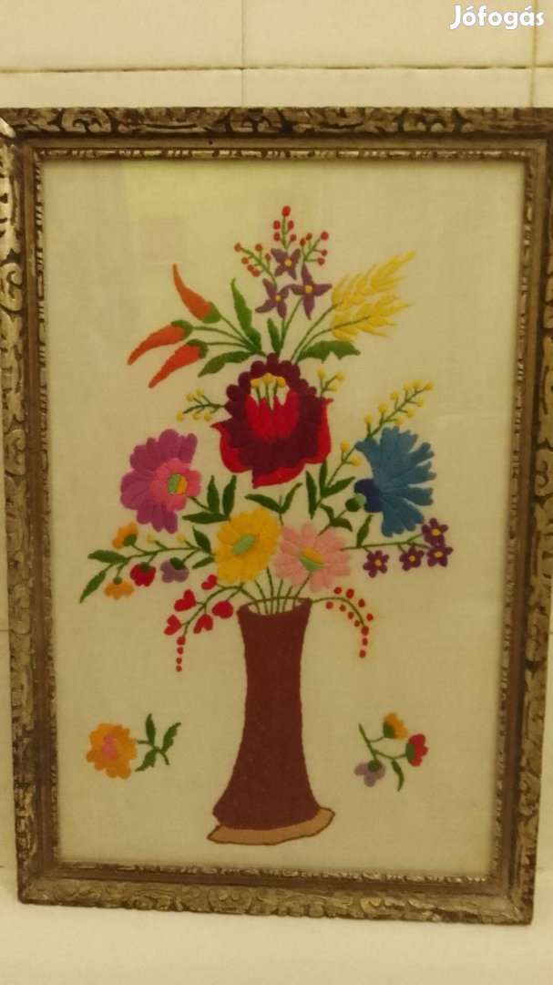 Kalocsai hímzés fehér háttérrel, keretezve.