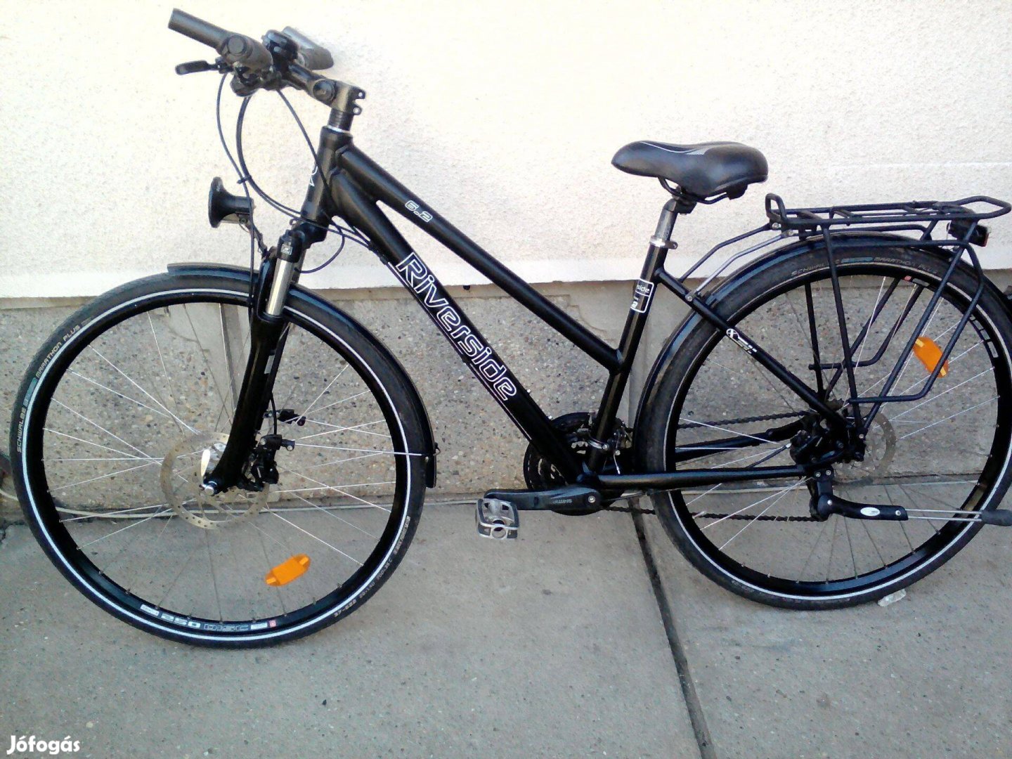 Kerékpár 28-as, Riverside, aluvázas, 27 fokozatú Shimano Deore váltó, első-hátsó Shimano hidraulikus tárcsafék, Shimano agydinamó, állítható zárható (lock) első teleszkóp, géles ülés, dupla falu szegecselt felni, Schwalbe Marathon defektmentes külső gumi, jó költségmentes azonnal használható állapotban eladó. 48 cm-es vázméret, 160 cm-es testmagasságtól.