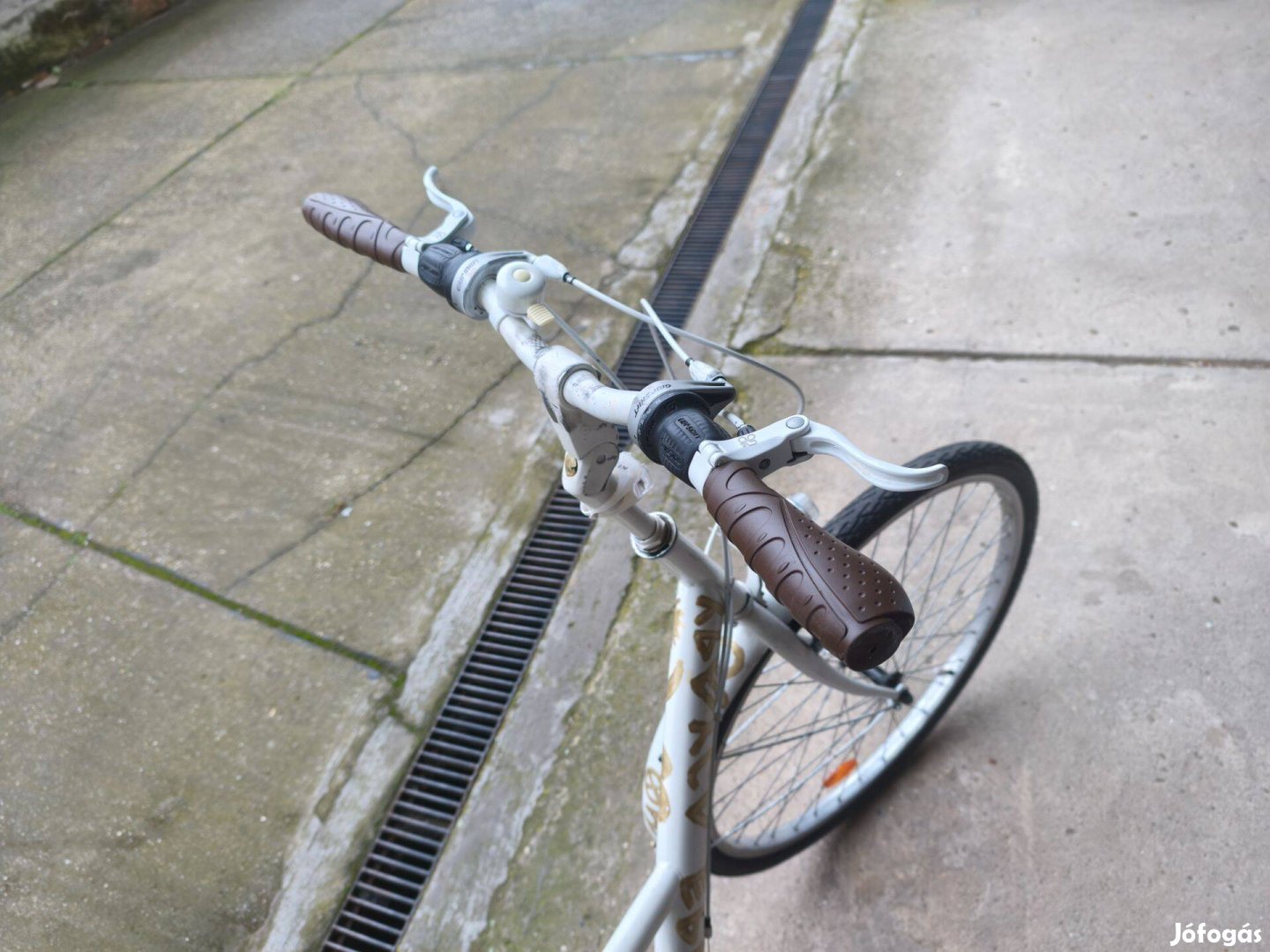 28", férfi kerékpár, fehér színű, 21 sebességes. Első, hátsó lámpa, Abus biztonsági zár. Simano váltó. Kézi, egyedi festésű.