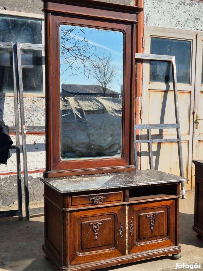 A fiók megvan, csak a képen hiányzik. Az ajtó nem csukódik megfelelően. A tükör szép, korának megfelelő állapotú.