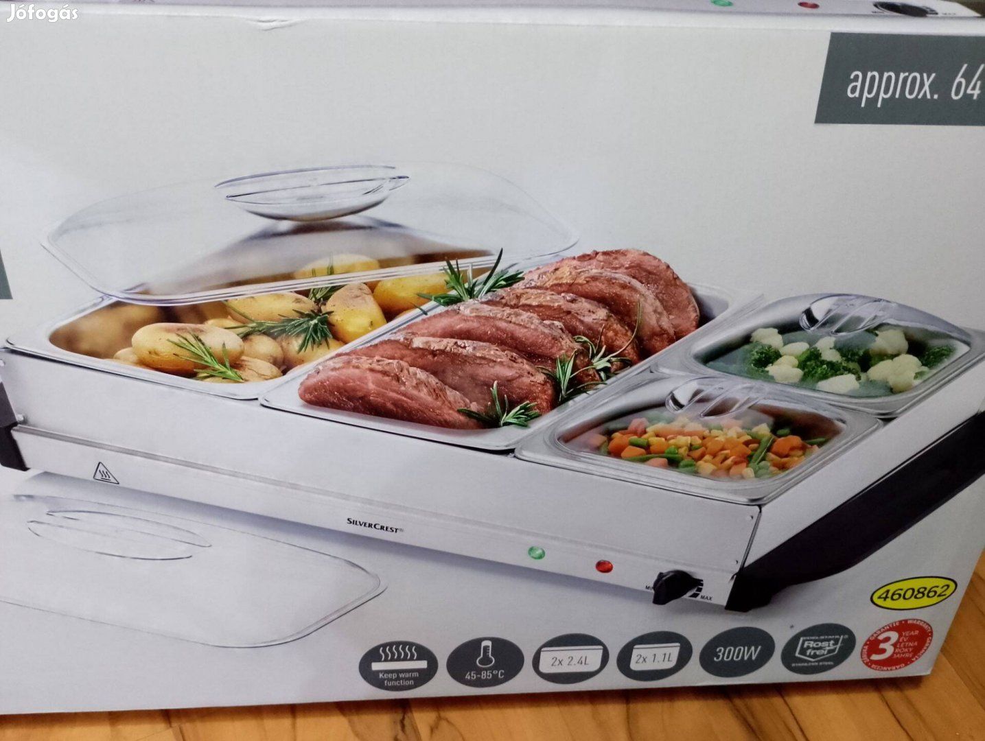 - Tartozék inox keret, 4 db inox tál és 4 db áttetsző fedő.