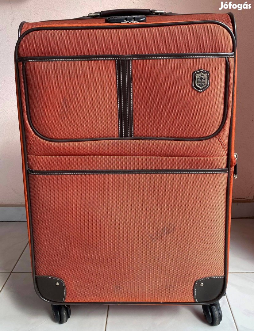 Narancssárga nagy méretű puhafalú bővíthető Michiko London Koshino bőrönd 4 kerékkel, elasztikus huzattal. A képeken látható jó állapotban. Mérete: 68×42×28 cm. Három kerékről a "futófelület" hiányzik, de attól gurul, húzható. A huzat utazás közben elszenvedett kisebb sérülései az utolsó képen láthatóak.