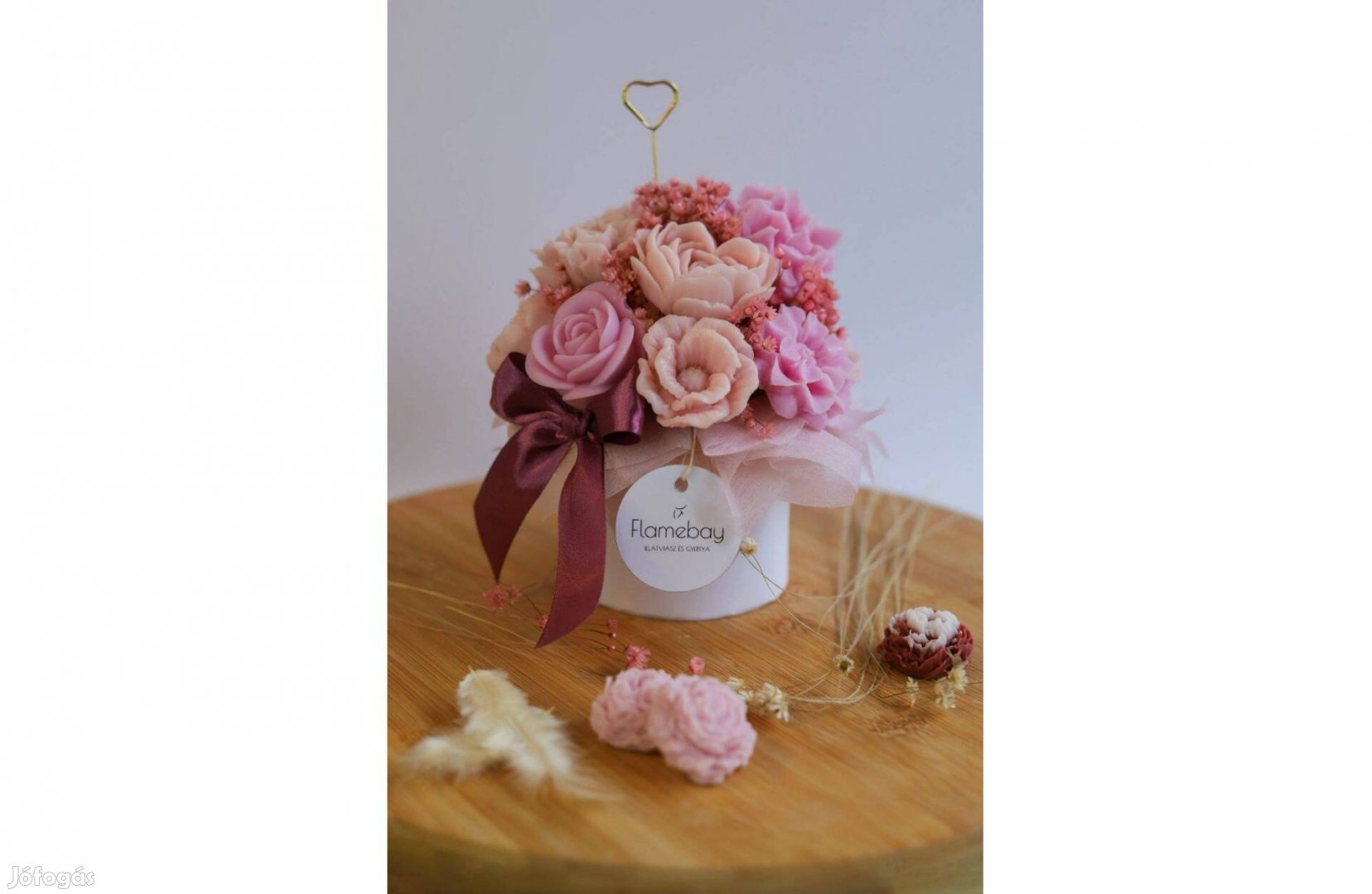 A Pink box illatviasz csokor rózsaszín árnyalatú virágokból készült, tulipán illatú, nőies hangulatú prémium dekoráció és ajándék.