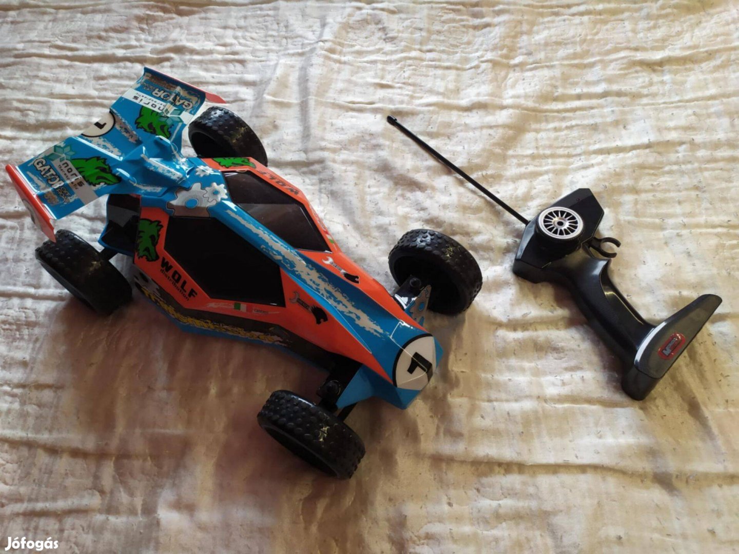 Eladó rádió irányítású autó. 40 cm hosszú. Sima talajon (legjobb a beton, aszfalt) előre-hátra megy, driftel, kanyarodik. Kisebb lejtős-emelkedős pályákon képes átugrani. Gyorsan megy, igazi élmény irányítani. Kb. 15-20 méteres hatótávolságból is működik. Az autóba 5 db AA ceruzaelem, a távirányítóba 2 db AA ceruzaelem (vagy tölthető ceruza akku) kell. Kipróbálható.