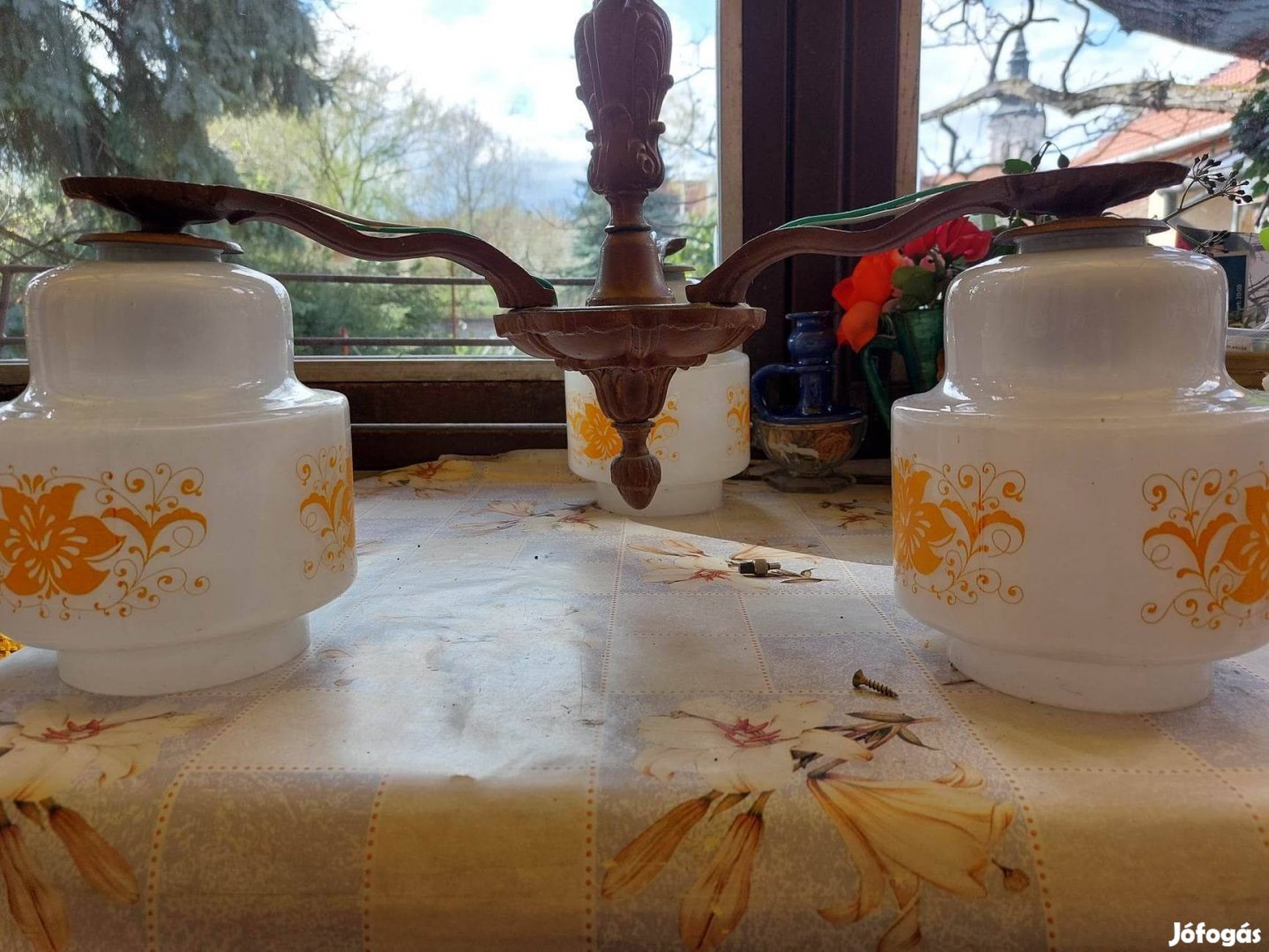 Eladó a képen látható régi stílusú, jó állapotú háromágú, üveg búrás mennyezeti csillár.