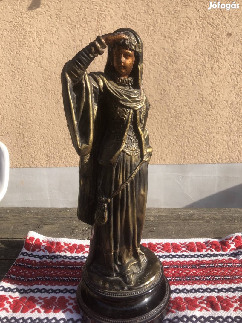 Eladásra kínálom ezt a lenyűgöző, klasszikus stílusú női alakot ábrázoló szobrot. A figura díszes, középkori vagy reneszánsz jellegű öltözékben látható, fejdísszel és fátyollal, jobb kezét a homlokához emelve, mintha a távolba tekintene. A szobor talpazatán a "Regina" (Királynő) felirat olvasható elegáns írással.