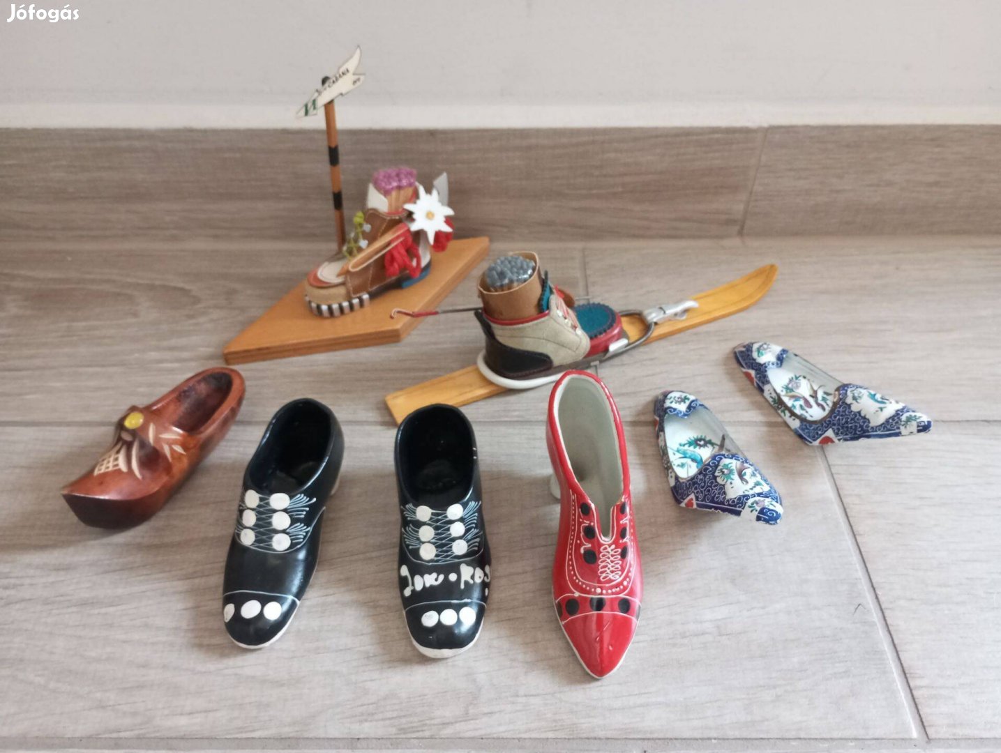 Anyaguk: porcelán, fa, egyéb. A túrabakancsben és a sícipőben gyufa van.
