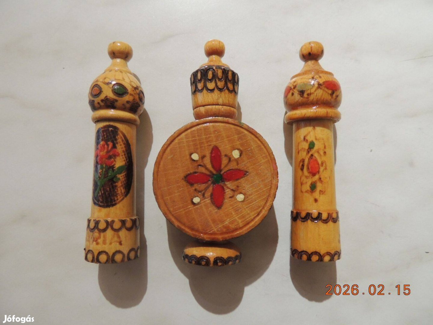 Retró bolgár rózsaolaj 3 különböző tárolója. Olaj nincs bennük, csak a fa tartóka. Egyben eladó.
