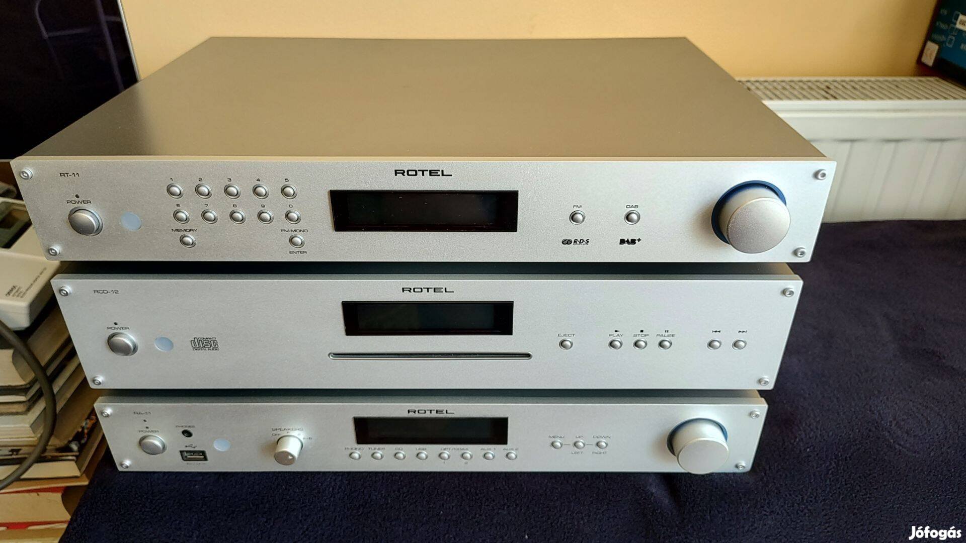 Rotel Hifi szett RA-11, RCD-12, RT-11 újszerű (2x40W 8óhm, 10Hz-10kHz,THD:0,03%,S/N ratio:100db,USB front, Wolfson Wm8740 192kHz/24bit DAC,5 analóg bemenet, 2xcoax,2x optikai bemenet, vonalszintű kimenet, CD:Wolfson DAC, 96dB dinamika, 100dB jel/zaj,MP3 lejátszás,stb, Tuner:FM RDS, DAB+ )gyári táv, csak egyben eladó,ÁR:349990FT fixár