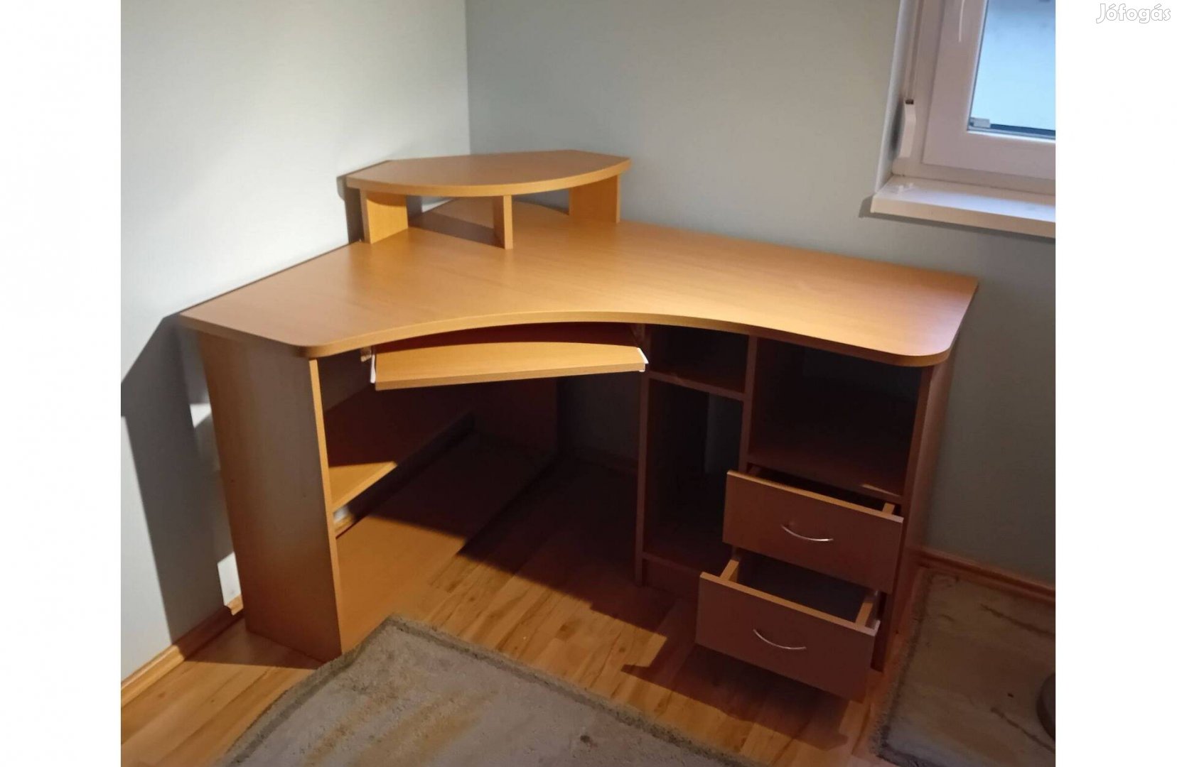 hibátlan állapotú, 100 X 135-ös balos íróasztal, bükk színű, klaviatúra- és monitortartóval, sok pakolóhellyel költözés miatt eladó.