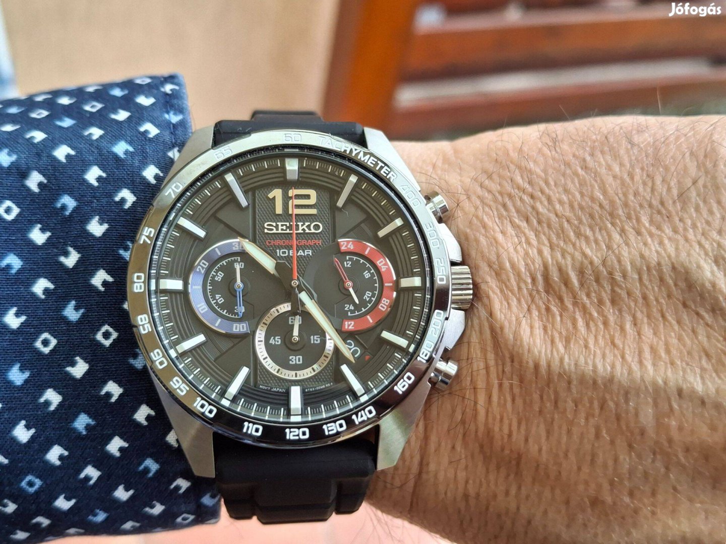 Eladóvá vált a képeken látható makulátlan, kifogástalan és karcmentes Seiko Chronograph karórám full szettben, vagyis eredeti Seiko dobozában, használati útmutatójával/kiskönyvével, kártyájával, fityegőjével, igazán vonzó megjelenéssel. Sportosan elegáns, hordatlan, vadonat új darab, ami különleges megjelenésű, több színben pompázik. A fekete-bronz testvéréhez képest lényegesen finomabb, hiszen több, egymást kiegészítő szín kifinomultabbá teszi. A fekete rendkívül kényelmes kaucsuk szíjjal nagyban harmonizál a fekete strukturált számlap, amiből kiemelkedik az ezüst tok. A fekete lünettán külön jól mutatnak a világos számok, mellyel nagyon passzolnak a világos mutatók. A kék és piros segédszámlapok pedig külön igényessé teszik a ketyegőt, de a tizenkét óránál feszítő piros mutató teszi fel a teljes megjelenésre a koronát.