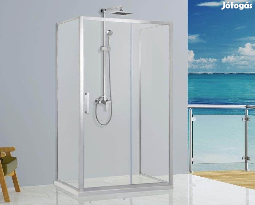 Tolóajtós falsíkra szerelhető 3 oldalú 100x80 cm aszimmetrikus zuhanykabin 6 mm vastag víztiszta edzett vízlepergető üveggel, krómozott rozsdamentes acél és alumínium elemekkel. A termék három oldalból áll. Egy darab zuhanyajtó és kettő darab fix zuhanyfal.
