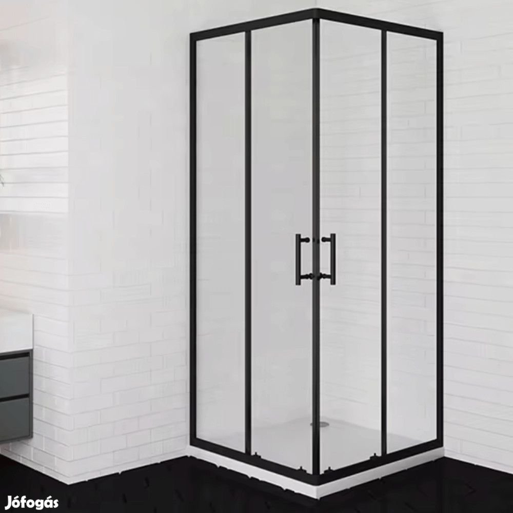 Fekete színű két tolóajtós, dupla alsó és felső görgős szögletes zuhanykabin 90x90 cm-es méretben 5,5 cm magas zuhanytálcával és króm szifonnal. A zuhanykabin 6 mm vastag víztiszta edzett vízlepergető biztonsági üveggel van ellátva, valamint rozsdamentes acél és alumínium elemekkel rendelkezik.