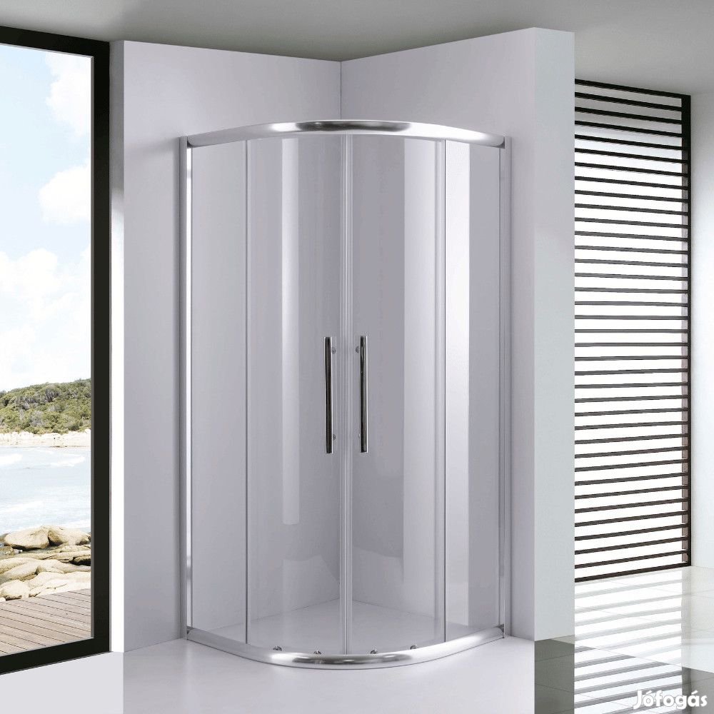 Saját márkás króm színű két tolóajtós, dupla alsó és felső görgős íves zuhanykabin 5,5 cm magas akril zuhanytálcával és szifonnal, magasított rozsdamentes acél fogganytúval, 90x90 cm-es méretben. A zuhanykabin 6 mm vastag víztiszta edzett vízlepergető biztonsági üveggel van ellátva, valamint rozsdamentes acél és alumínium elemekkel rendelkezik. Az ajtó mágneses zárral rendelkezik. A zuhanykabin vízzáró szilikon csíkokkal van ellátva.