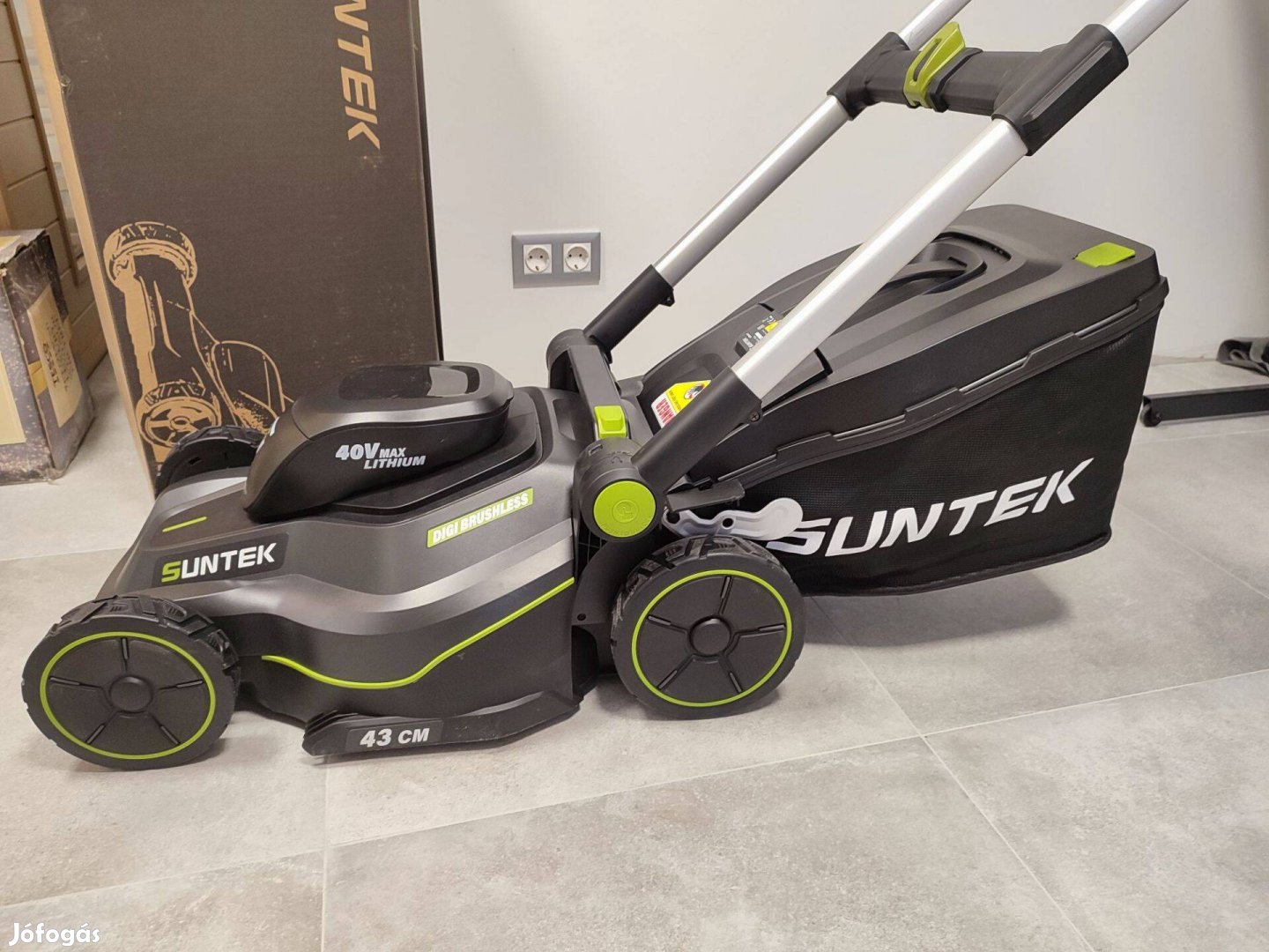 Eladó új Suntek 40 V-os akkumulátoros fűnyíró dobozában. Tartozék 40V 4Ah akkumulátor és töltő!