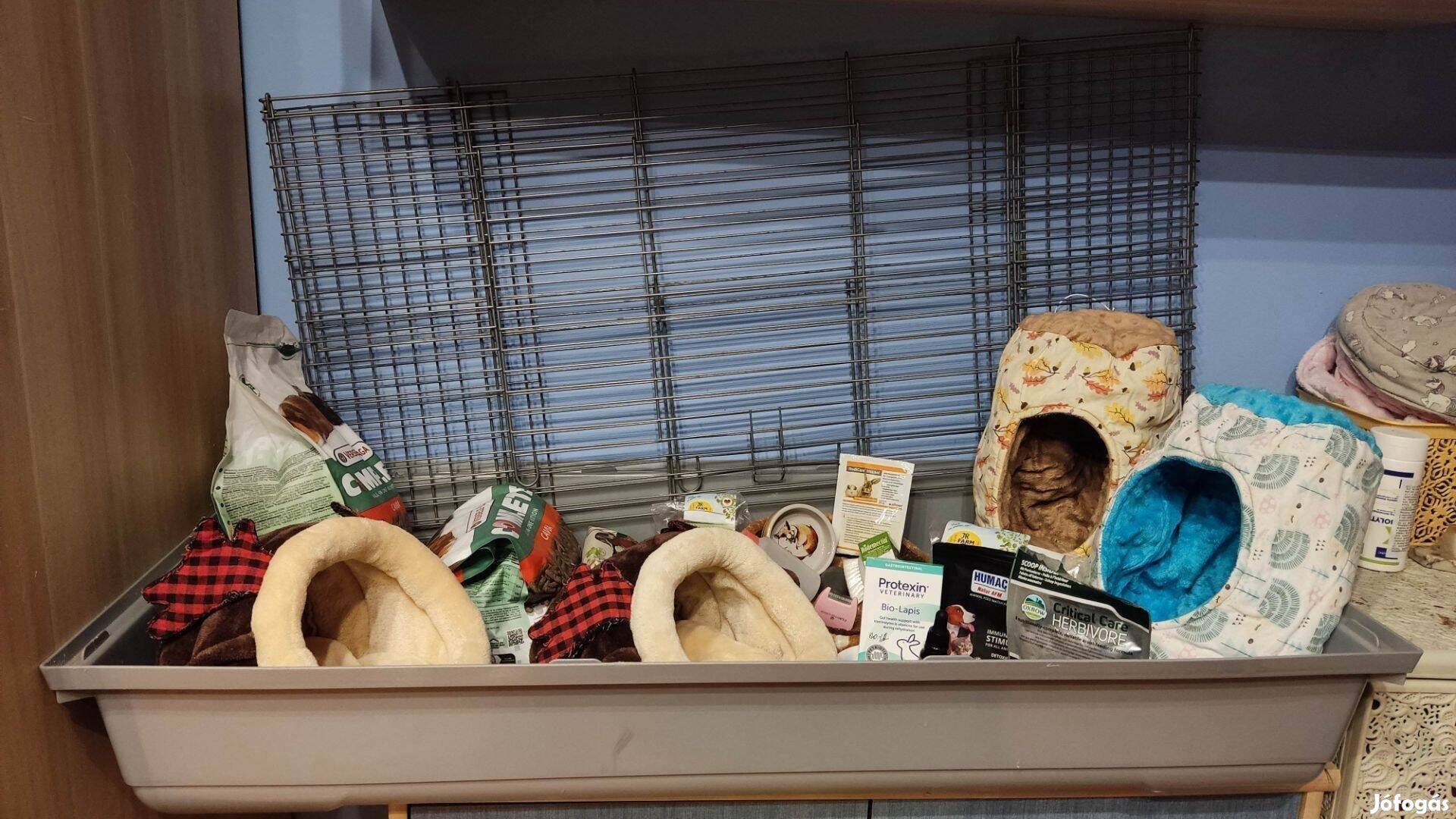 Tengerimalac felszerelés, ketrec, tálak,itató,fekhelyek,hordozó,széna,táp,vitaminok,olló stb. egyben eladó.