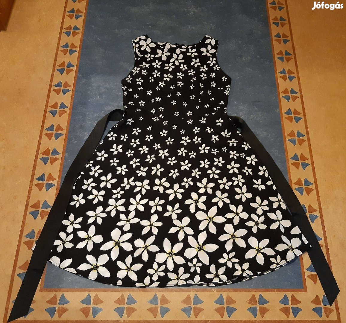 Új Tchibo fekete alapon fehér virágözön - ujjatlan - viszkóz ruha, hozzávaló ripsz övvel; hátul hosszan zippzáros.