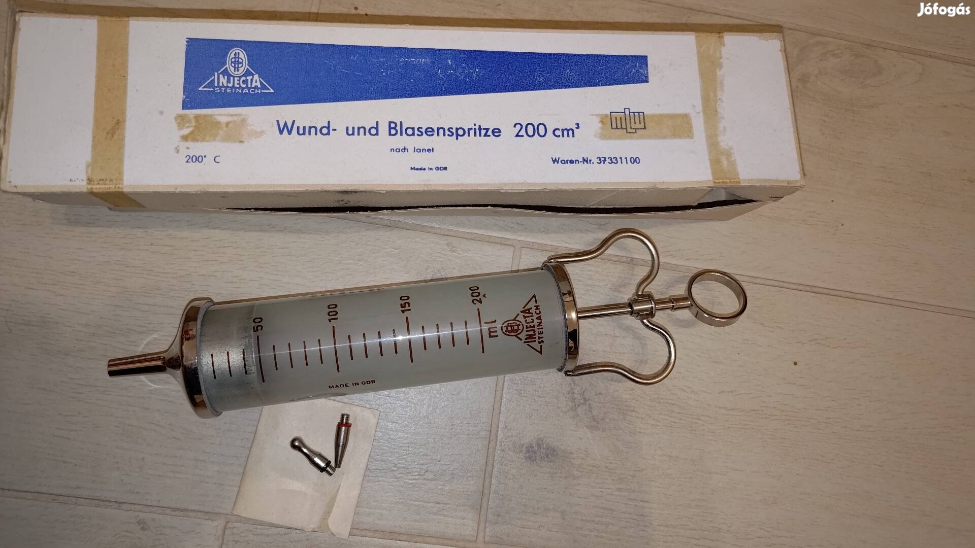 Eladó 200 cm?-es üveg fecskendő. Csavaros hegyes és tompa vég van hozzá. 200 fokig sterilizálható. Gyári bontatlan csomagolásban.