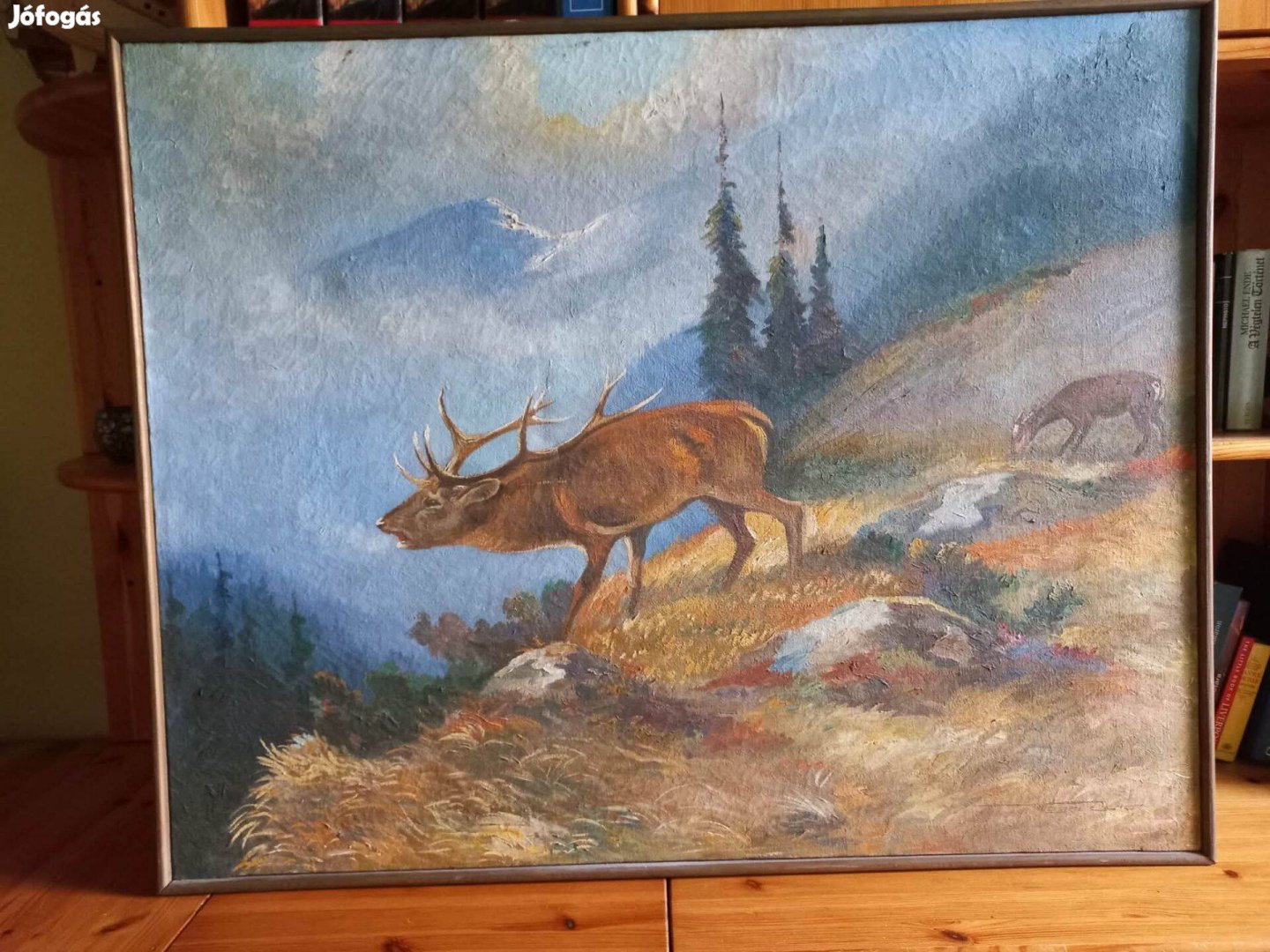 Eladó egy hangulatos, klasszikus stílusú tájkép, amely egy méltóságteljes szarvasbikát ábrázol az erdő szélén.