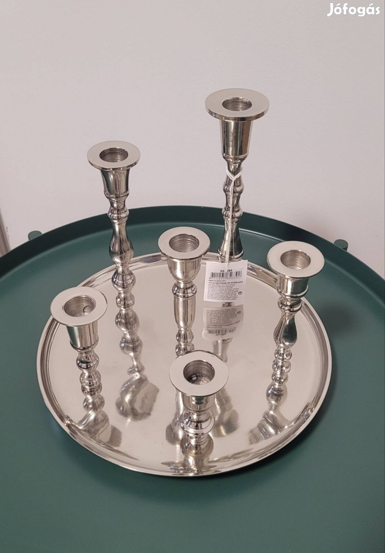 Vadonat új tükörfényes fém 6 ágú gyertyatartó eladó dobozában. 25cm a tálca átmérője, a legmagasabb gyertyatartó rúd 20cm.