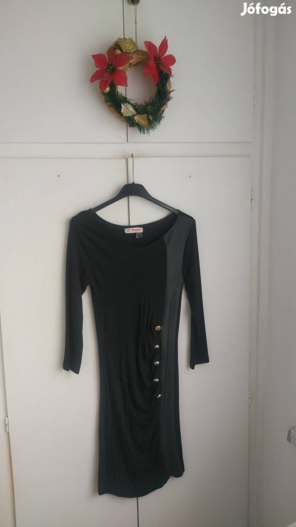 Kihasználatlanság miatt eladó pamut és bőrhatású sztreccs, gombokkal díszített alkalmi ruha.