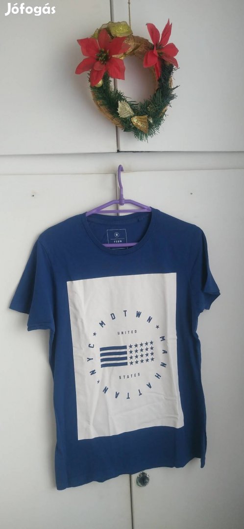 Eladó sötétkék fehér írásos mintás férfi póló.