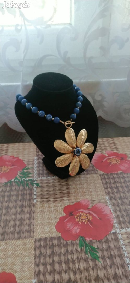Kihasználatlanság miatt eladó kék szem gyöngyökkel díszített arany színű virág mintás nagy mutatós nyaklánc.