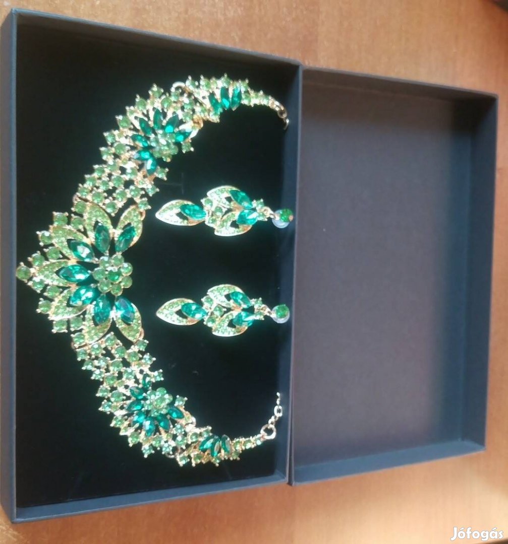 Kihasználatlanság miatt eladó neon és sötét zöld kristály és strassz kővel kirakott esküvői luxus 3D dimenziós 18 K aranyozott ékszer szett.