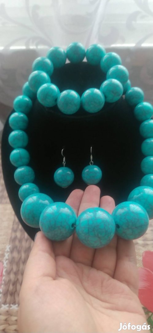 Kihasználatlanság miatt eladó nagy türkiz ásvány gyöngyökkel díszített mutatós komplett alkalmi ékszer szett.